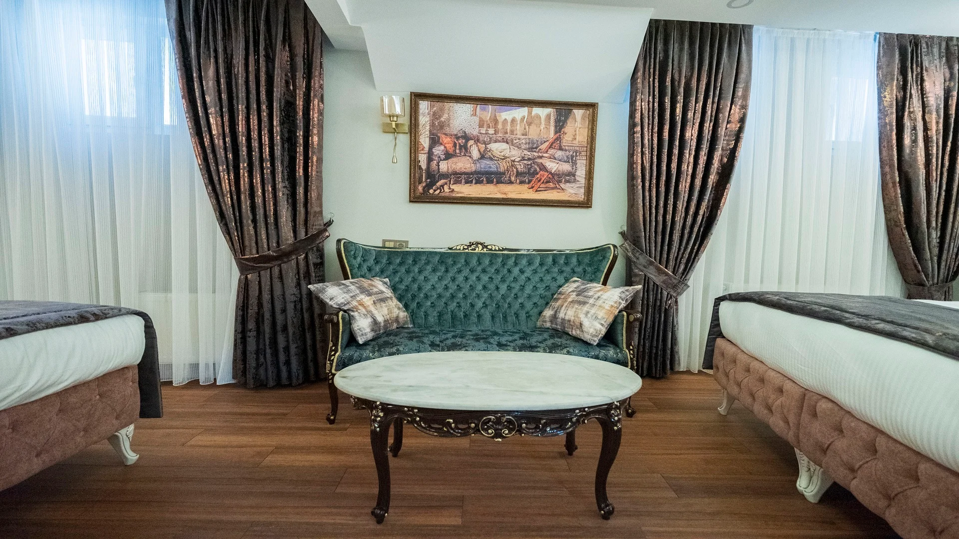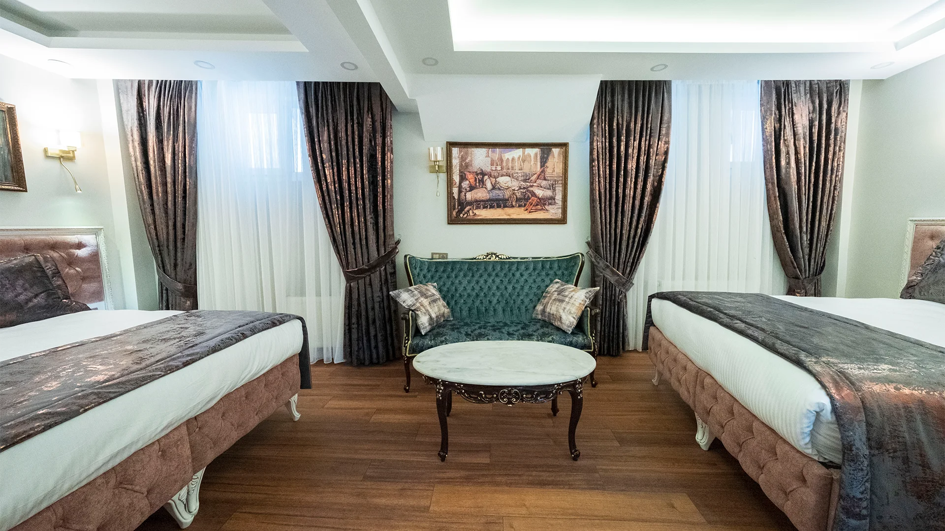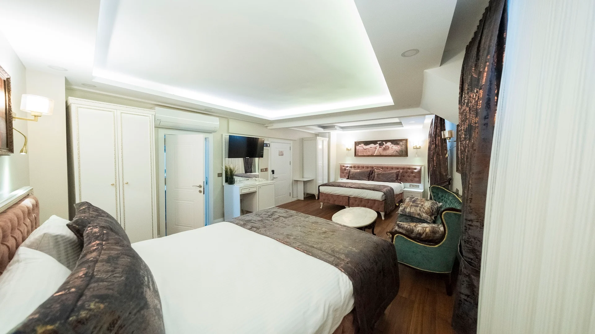 Deluxe Quadruple Rooms, one of the most exclusive room options at Solomon's Mansion, offer a magnificent accommodation experience for guests seeking luxury and comfort. This room option provides a meticulously designed, comfortable, and elegant living space. Our rooms have a spacious layout with separate seating area, bedroom, and a private bathroom.